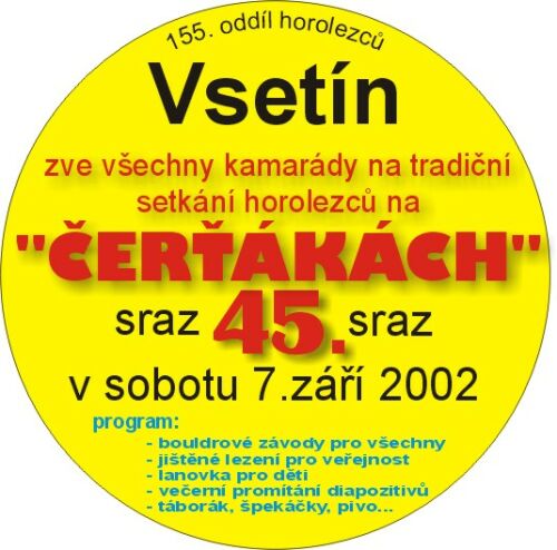 V sobotu 7.září se uskuteční už 45. horolezecký sraz na Čertových skalách u Lidečka pořádaný 155. HO Vsetín. Bližší informace na http://www.volny.cz/hribvs.