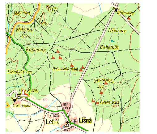 Přístup: Z obce Líšná (sem autobusem ze Zbiroha) asi 2 km severovýchodně po silnici směrem k hájovně Na Hřebenech, poté doleva do lesa ke skále. Bivakování: Pod východní stěnou.