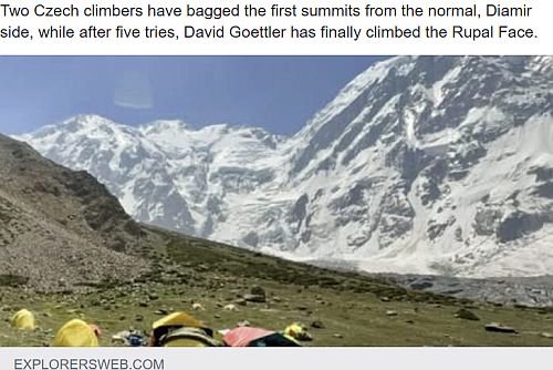 Na pákistánskou osmitisícovku Nanga Parbat (8126 m n. m.) vylezli nedávno dva čeští horolezci Marek Novotný a Ondra Hlásný. Koncem června o tom informoval portál Explorersweb.com. Lezli normálkou z diamírské strany. ... celý článek