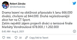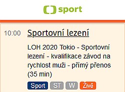 Lezení bylo na ČT sport druhou nejsledovanější akcí olympiády po tenisovém finále Markéty Vondroušové, informoval na Twitteru sportovní redaktor Robert Záruba: "Drama lezení na obtížnost připoutalo k lanu 666.000 diváků, chvílemi až 844.000. Druhá nejsledovanější akce her na ČT Sport." ... celý článek