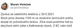 Mára Holeček a Radek Groh při sestupu z Baruntse, kde po úspěšném prvovýstupu Z stěnou uvízli od 25. května kvůli počasí ve výšce 7000 m, slezli dnes 1100 m "ve strašném lavinovém sněhu" a podařilo se jim dostat do pohodového terénu. Zítra mají snad letět helikoptérou do Lukly. Informovali o tom před chvílí na Facebooku: ... celý článek