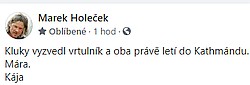 Mára Holeček a Radek Groh po včerejším sestupu z Baruntse, kde po úspěšném prvovýstupu Z stěnou na vrchol uvízli od 25. května kvůli počasí ve výšce 7000 m, už letí vrtulníkem do Káthmándú. Informují o tom na Facebooku: ... celý článek