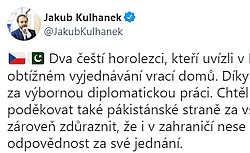 Dva čeští horolezci Jakub Vlček a Petr Macek, kteří uvízli v Pákistánu po výstupu na Rakapoši a následné akci na jejich záchranu, "se po obtížném vyjednávání vrací domů", informoval před chvílí na Twitteru český ministr zahraničí Jakub Kulhánek.
