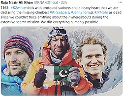 Tři nezvěstné horolezce na K2 prohlásily včera pákistánské úřady za mrtvé. Islanďan John Snorry, Pákistánec Ali Sadpara a Chilan Juan Pablo Mohr zmizeli počátkem února, když se pokoušeli o závěrečný výstup na vrchol K2. ... celý článek