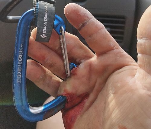 Foto: Karabinou propíchnutá dlaň ruky lezce při pádu