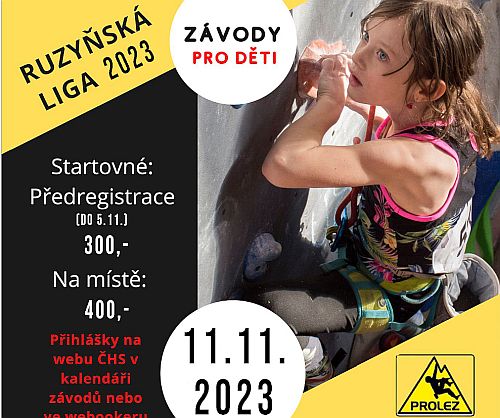 Ruzyňská liga - závod pro děti proběhne 11.11.2023 na lezecké stěně v Praze 6 Ruzyni. Kategorie U8, U10, U12, U14, U16 a U18. Obtížnost, 3 cesty bez finále. ... celý článek