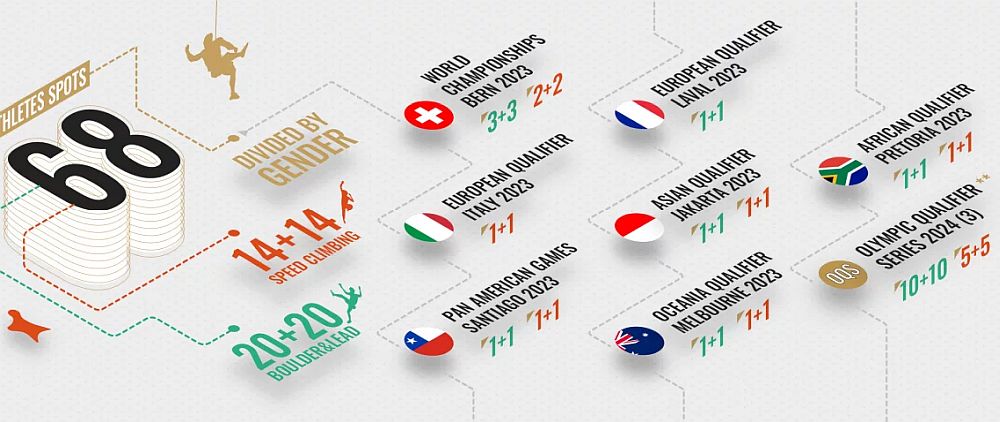 Na olympiádu v Paříži 2024 se nyní na mistrovství světa v lezení v Bernu kvalifikují 3 muži a 3 ženy z kombinace bouldering&obtížnost a 2 muži a 2 ženy v rychlosti. Celkem se má kvalifikovat 68 lidí, a to 20 mužů a 20 žen v kombinaci a 14 mužů a 14 žen v rychlosti. Podívejte se na seznam kvalifikačních pravidel: ... celý článek