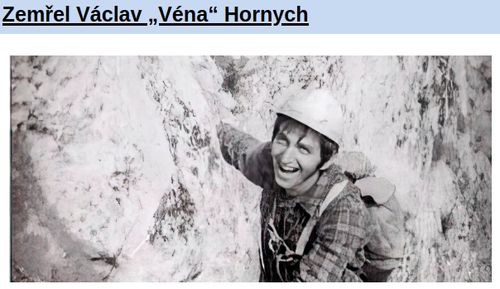 Ve věku nedožitých 82 let zemřel 2. února Václav „Véna“ Hornych, významný polický horolezec, který přes šedesát let působil hlavně ve skalních oblastech na Adršpašsku, kde zanechal mnoho prvovýstupů, jako například údolní hranu na Štěpánskou korunu, nebo Zámecké schody na Zámek. ... celý článek
