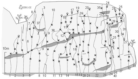 Jištění bohrháky. Lano lépe mít 70 nebo dokonce 80 m. Lze místy využít i friendy a vklíněnce.