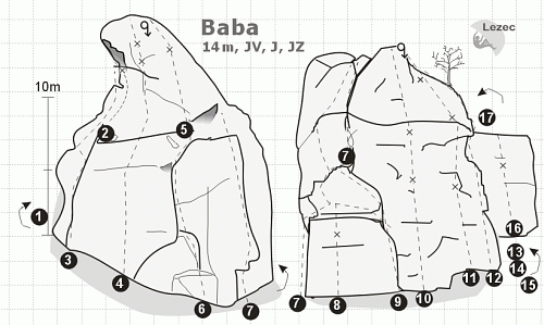 Nepříliš vysoký ostroh tyčící se nad zákrutem řeky Úslavy v malebné krajině s pěknými výhledy a lezením v členité skále. To vše nabízí Baba.