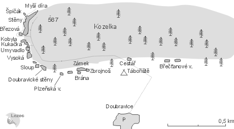 Zaparkovat vlevo na vyznačeném parkovišti před vjezdem do osady Doubravice. Projít vesnicí (250m) a kolem studny šikmo doprava (nevstupovat na soukromý pozemek) úvozovou cestou kolem ranče, do kopce a pak mírně zpět až na samotný vrchol kopce a k jednotlivým sektorům, které jsou po obvodu.