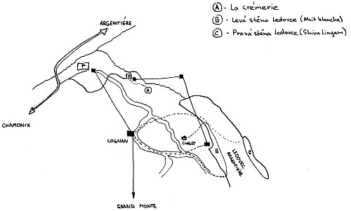 Vlastní ledy se nacházejí pod ledovcem Argentiere a jeho stranách. Dají se rozdělit do tři částí. První a nejnizší je La Cremerie, leží v kotlině vymleté ledovcem asi 20 min nad dolní stanici lanovky na Grand Monte. Další dvě jsou na bočních stěnách nad ledovcem, napravo Shiva Lingam a nalevo Nuit Blanche. Výchozím místem ke všem je parkoviště u dolní stanice lanovky.