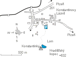 Z centra Konstantinových Lázní, lázně leží asi 20 km severozápadně od Plzně, se vydáte silničkou na jih směrem na Okrouhlé Hradiště, asi po půl km je odbočka vlevo mírně do protisměru lesní cestou , po levé straně jsou chaty, nejprve asi 200 m autem pak na loučce zaparkujete a vydáte se již pěšky mírně do kopce, je to značeno na lom, asi 5 minut k lomu, který leží na severní straně Hradišťského kopce. Dá se zeptati místních, každý ví, kde se nachází lom.