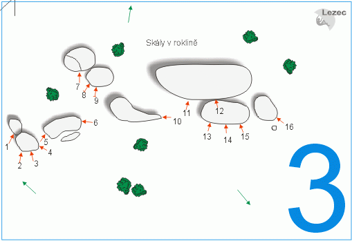 | Přístup | | Přístup je nejpohodlnější od hřiště, za domem alejí a přes louku do lesa. Zde minete Vyhlídkovou a stále stoupáte vzhůru až ke kamenu Trabant. | | Popis oblasti | Jedna z nenověji zmapovaných oblastí, kde se nachází zatím několik kamenů ale je zde i další potenciál zejména pro lehčí boulderproblémy.