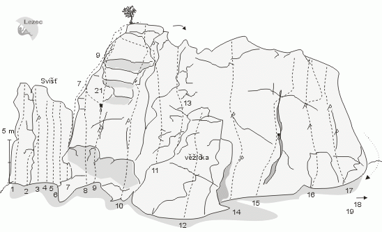 Na skále se zorientujete pomocí poněkud vybledlých šipek, které jsou také očíslovány. Cesty vedou v kolmé až mírně převislé skále a dosahují délky kolem 10-15m.