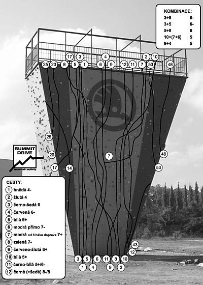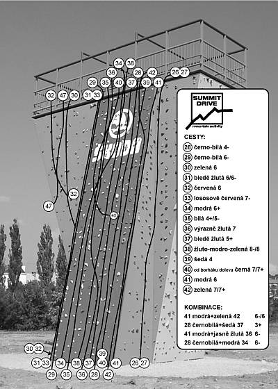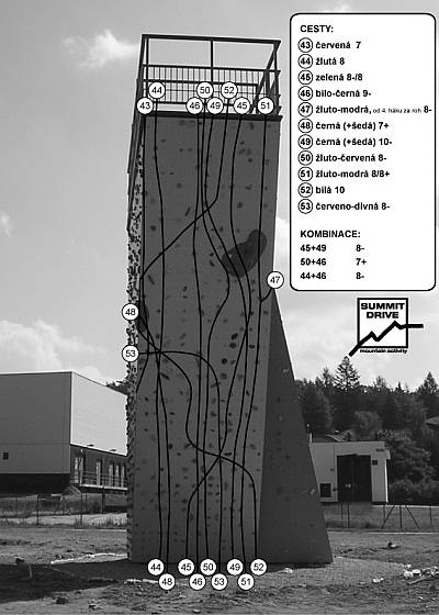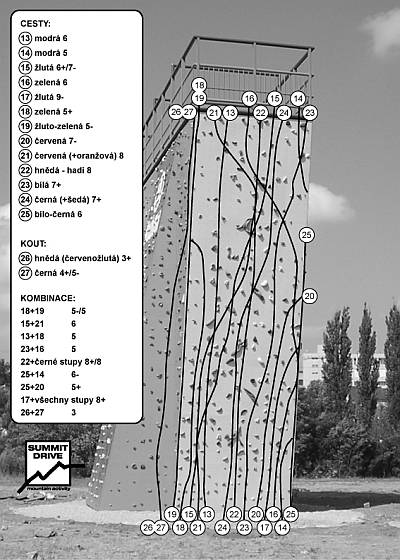 Na Lezecké věži je cca 70 cest, z toho přes 40 v jedné barvě a zbytek je kombinací dvou barev. Cesty stavěl Štěpán Neustupný a nejvíce jich je v obtížnosti 6 a 7. Nejtěžší cesta je za 10 a nejlehčí za 3 UIAA. Na vrcholu věže jsou umístěny dvě příčné trubky sloužící k nácviku a ukázkám zavěšení do slanění. V půlce poklopené stěny jsou tři místa s dvěma nýty určené pro nácvik zřízení štandu.