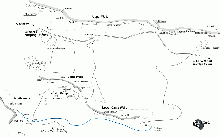 Oblast se nachází asi 20km severo západně od Antalye. Nejlepší přístup je autem, přes vesnice Bahtili, Cakirlar a Akdamlar. Přímo do vesnice Geyikbayiri už nedorazíte skály jsou podél silnice pod vesnicí.