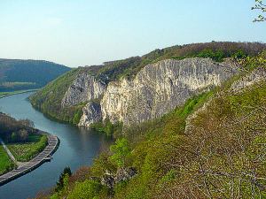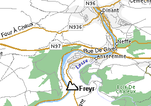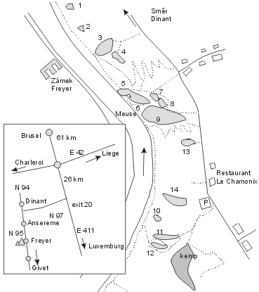 Z parkoviště asi 300m směrem na Dinant před stánkem sestoupit po klikatém strmém sestupu k Meuse a podél řeky (100m) dolů po proudu ke stěně.