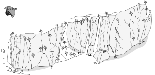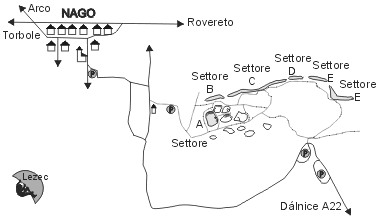 Projet vesnicí Nago (pozor hrozně úzké uličky) a serpentýnama vystoupat až mírně nad skalní masivy odtud (nic nenechat v autě) traverzem ke stěnám (10 min). Voda u kostela ve vsi, nahoře u hlavní silnice.