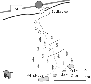Ze zastávky Svojkovice do turistické značce kopce a po 25 min dojdete k Velkému oltáři. Vyhlídková skála je asi 200 m napravo od cesty.