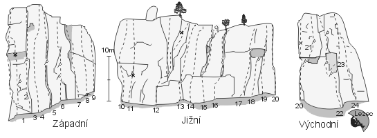 Skálu lze rozdělit na 8 částí avšak pro lezení mají význam pouze tři sektory. Celý rozsáhlý vrchol je státní přírodní rezervací s pralesním porostem skalních buků a různými botanickými zvláštnostmi. Nedaleko se také nachází unikátní kamenné moře.