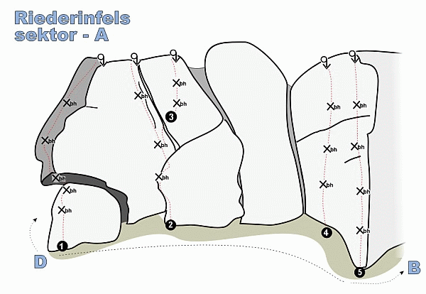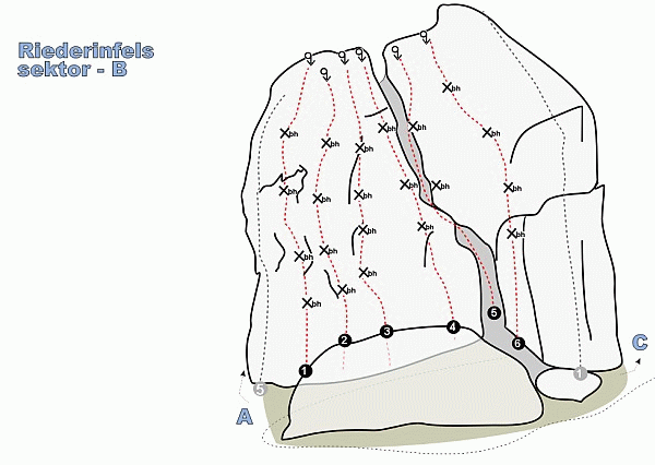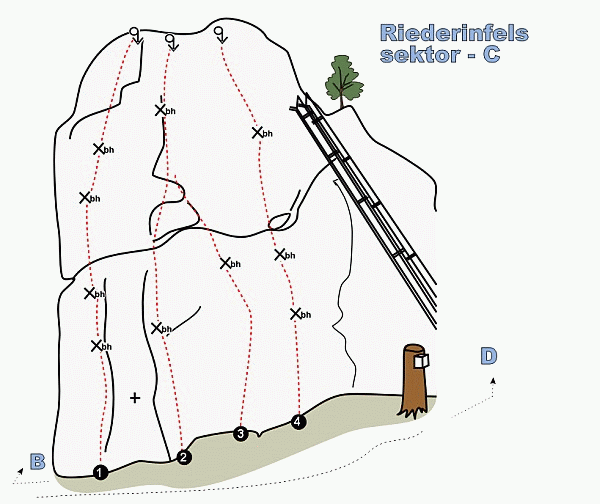 | Stát | | Německo | | Kraj | | Bayerische Wald | | Materiál | | svor | | Charakter | | sport | | Jištění | | nýty | | Klasifikace | | 4 až 8+ |