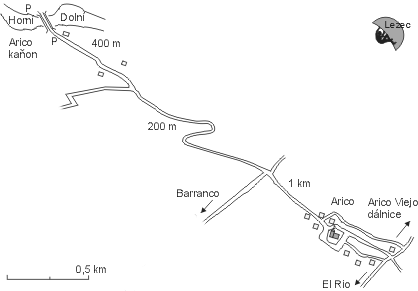Pokud přijíždíte z dálnice, projeďte kruhový objezd na začátku vesnice Villa de Arico rovně (vedle sebe jsou 3 vesnice s Arico v názvu) ve směru na El Contador, pokračujte stále do kopce. Po projetí dvou 180° serpetin stojí na pravé straně silnice výrazný kamenný mužik, zaparkujte na levé straně - tak, abyste nepřekáželi provozu (28.1795872N, 16.5138806W). Od mužiku vede jasná a mužiky dobře značená pěšina na dno kaňonu, po jehož stěnách se leze.