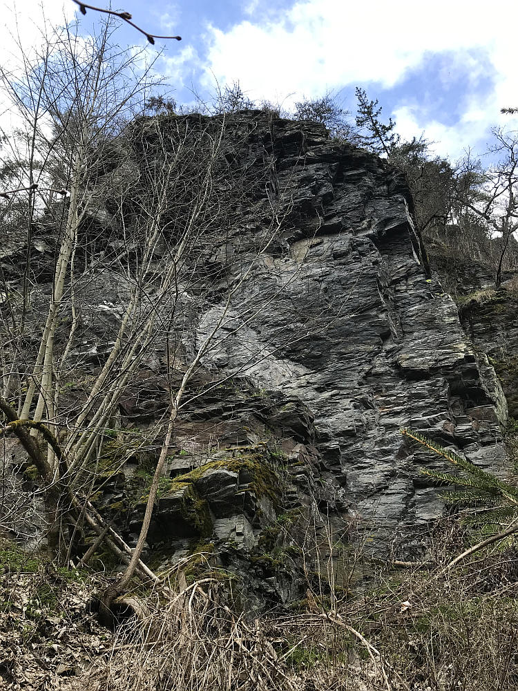 Břidlicové skály Falkenštejnu prorostlé křemenem se nacházejí hluboko pod zarostlými skalnatými svahy přímo pod zbytky hradu a spadají k JV a k V stěnami do údolí Úterského potoka.