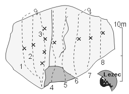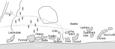 1) Za Oborama ve směru na Sedlčany odbočit doprava směrem na Velkou a zaparkovat u statných dubů pak směrem na jiho-východ k lesu a na vrchol masivu. Sestup roklí nebo slaněním. Na nákresu je naznačen jiný přístup nad vesnicí Velká - než sjedete z kopce, tak u koní odbočit na malou prašnou odbočku do kopečka, záhy zaparkovat a lesem podél zlomu svahu nad skály.