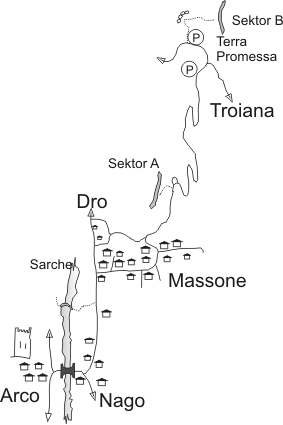 Malé parkoviště asi 500m od skal u silničky z Massone směr na Troianu.V sektoru se nachází 25 cest.