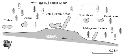 Nejhezčím sektorem je Velká Jezerní Stěna, kde je i pár těžších cest. Velká Jezerní stěna uprostřed spadá až k vodě, některé cesty začínají traverzem nad hladinou. Stěnu nelze podejít, takže pokud se chcete dostat z pravé části do levé, musíte stěnu obejít horem. Stěna má také horní patro, ve kterém vede vícero kratších cest. Sestoupíte sem pěšinou shora, jako první vás uvítá cesta Tupá Hranka.