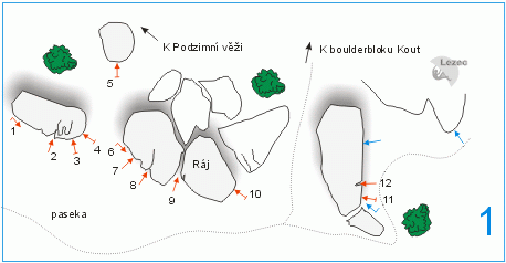 Od parkoviště u hřiště cestou doleva na louku (nad hřištěm) a stále cestou přes louku vzhůru směrem k lesu. Po též cestě (zprava se připojuje zelená tur. zn.) dojedeme do části Josemit (vlevo) a Podzimní věž, 50 m vpravo, nedá se přehlédnout.