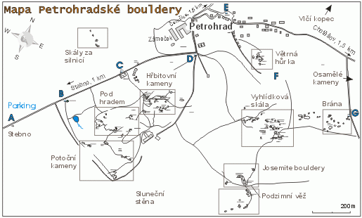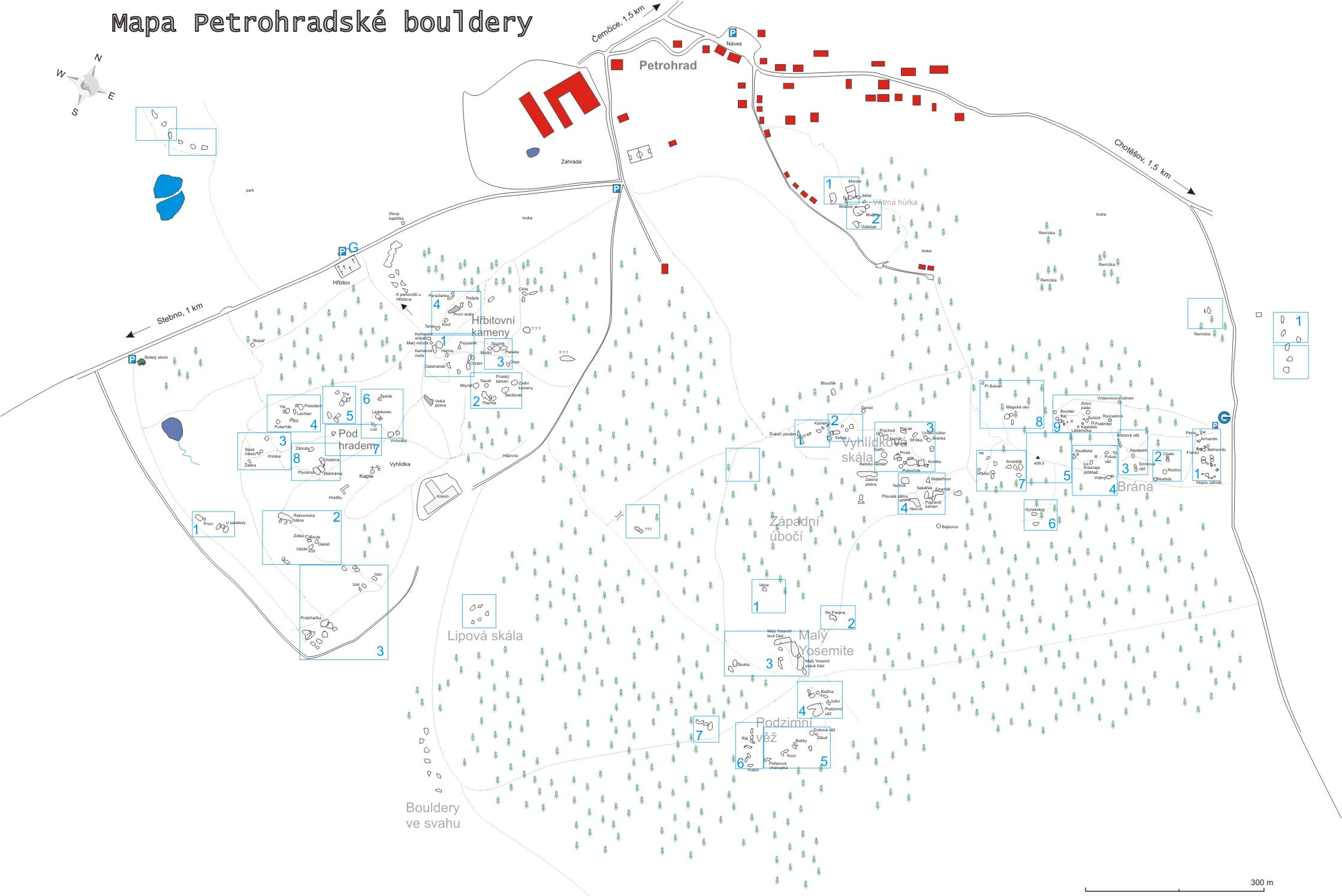 Počátkem roku 2003 tuto oblast přímo pod petrohradským hradem pro bouldristy objevili a vyčistili Petr Resch a Karel Hegr. Podle nich se zde nalézají nejhezčí bouldry v české kotlině, hlavně Vysoké přepětí na Elektrárnu. Kámen Vašek je jedním z nejvyšších na Petráči vůbec. Prostě zde naleznete spoustu skvělých směrů. Mezi nejtěžší patří Kanagom 8A se smrtelnými boulemi, na které musí opravdu lepit. Kámen Elektrárna byl i v TV s partičkou z BB... Po dešti některé bouldry vysychají dříve (U Rakovnické stěny, některé déle (Vrchcáby).