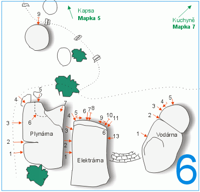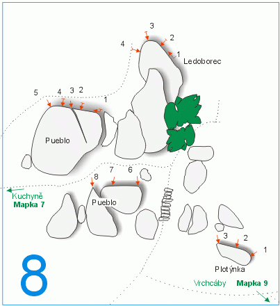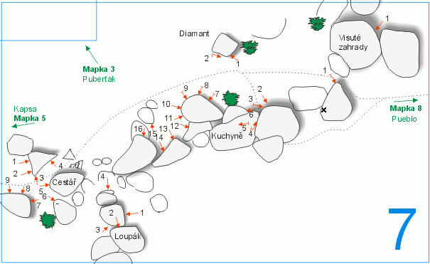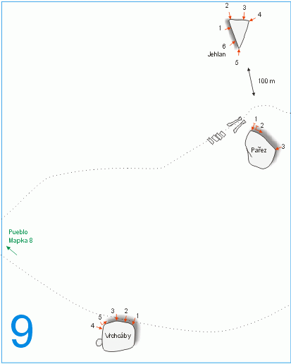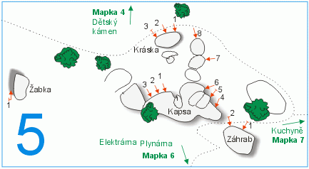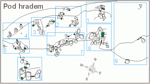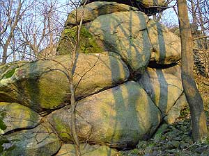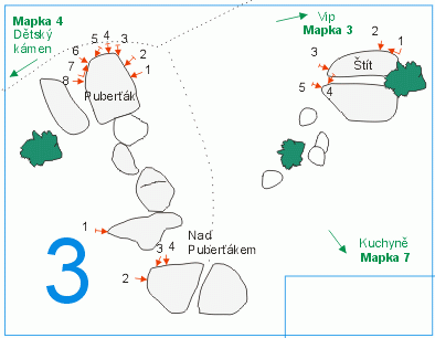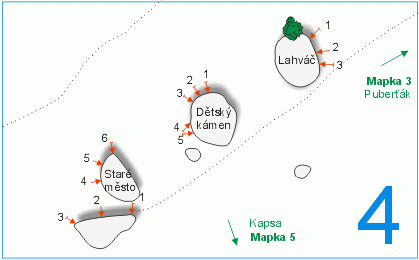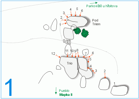 Projet Petrohradem kolem zámku až k hřbitovu, zde zaparkovat. Po cestě kolem hřbitova vzhůru, u prvních Hřbitovních kamenů (Kamenné srdce) najděte cestu doprava. Za chvíli dojdete k útvarům Trio až Puberťák. Pak se po pěšině, místy dobře ukryté, dostanete do části Pod hradbami (Plynárna, Elektrárna, Vodárna...).